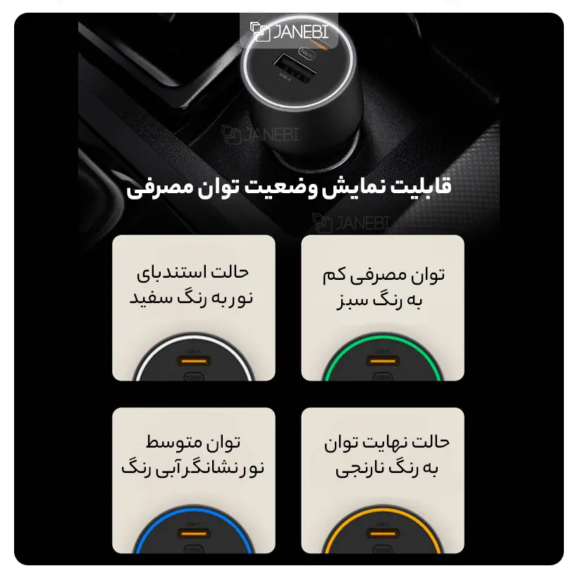 برای راحتی در استفاده شبانه از شارژر فندکی و نمایش وضعیت توان مصرفی، نوار ال ای دی بصورت یک دایره در سطح شارژر قرار داده شده است. در حالت استندبای، نور به رنگ سفید خواهد بود تا بتوان به راحتی درگاه های خروجی را به هنگام شب پیدا کرد. در حالت استفاده، اگر دستگاه متصل شده توان مصرفی کمی داشته باشد به رنگ سبز خواهد بود. در استفاده ها با توان متوسط نور نشانگر آبی رنگ و در حالت نهایت توان، به رنگ نارنجی تغییر می کند.