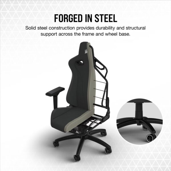 اسکلت و بدنه‌ی اصلی Corsair TC200 Gaming Chair Soft Fabric – Black و همینطور پایه‌ی چرخ‌های آن از فولاد ساخته شده‌اند و به‌این‌ترتیب تحمل فشار زیادی دارند و عمر مفید صندلی را در بلندمدت تضمین می‌کنند.
