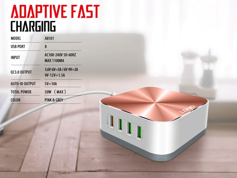 یکی از این هشت پورت روی شارژر الدینیو A8101 مجهز به فناوری شارژ سریع ۳٫۰ است و دارای جریان حداکثر ۳ آمپر می باشد. این پورت می تواند گوشی سازگار بااین فناوری را سریعتر از معمول شارژ کند.