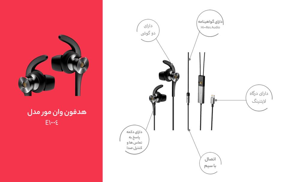هدفون «E1004» محصول برند «وانمور» است که در تولید هدفونهای باکیفیت شهرت دارد. ازآنجاکه هدفون E1004 دارای کانکتور لایتنینگ است، برای دستگاههای مجهز به درگاه لایتنینگ مناسب است. صدایی که این محصول وانمور (۱More) به کاربر ارائه میدهد، با بهرهمندی از گواهینامه Hi-Res Audio ژاپن توانسته است، نظر مخاطبین را به خود جلب کند. در ساخت این هدفون توگوشی یا ایرفون از تکنولوژی Air Titanium استفاده شده است. قابلیت کاهش نویز در آن باعث میشود کاربر صدایی شفاف و با حداقل نویز در اختیار داشته باشد. روی سیم این هدفون دکمهی پاسخ به تماس تعبیه شده است و دکمههایی هم برای جابهجاشدن میان فایلهای موسیقی و تنظیم بلندی صدا وجود دارد. طول این کابل ۱۲۰ سانتیمتر است. شما میتوانید از طریق این دکمه به تماسهای خود پاسخ داده و از طریق میکروفون هدفون E1004 به مکالمه بپردازید. بنابراین به جداکردن هدفون نیازی نیست. امپدانس ۳۲اهمی این هدفون نشان میدهد که از هدفونهای ۱۶اهمی کیفیت صدای بهتری دارد و گفتنی است پاسخ فرکانسی آن بین ۲۰ تا ۲۰۰۰۰ هرتز است.