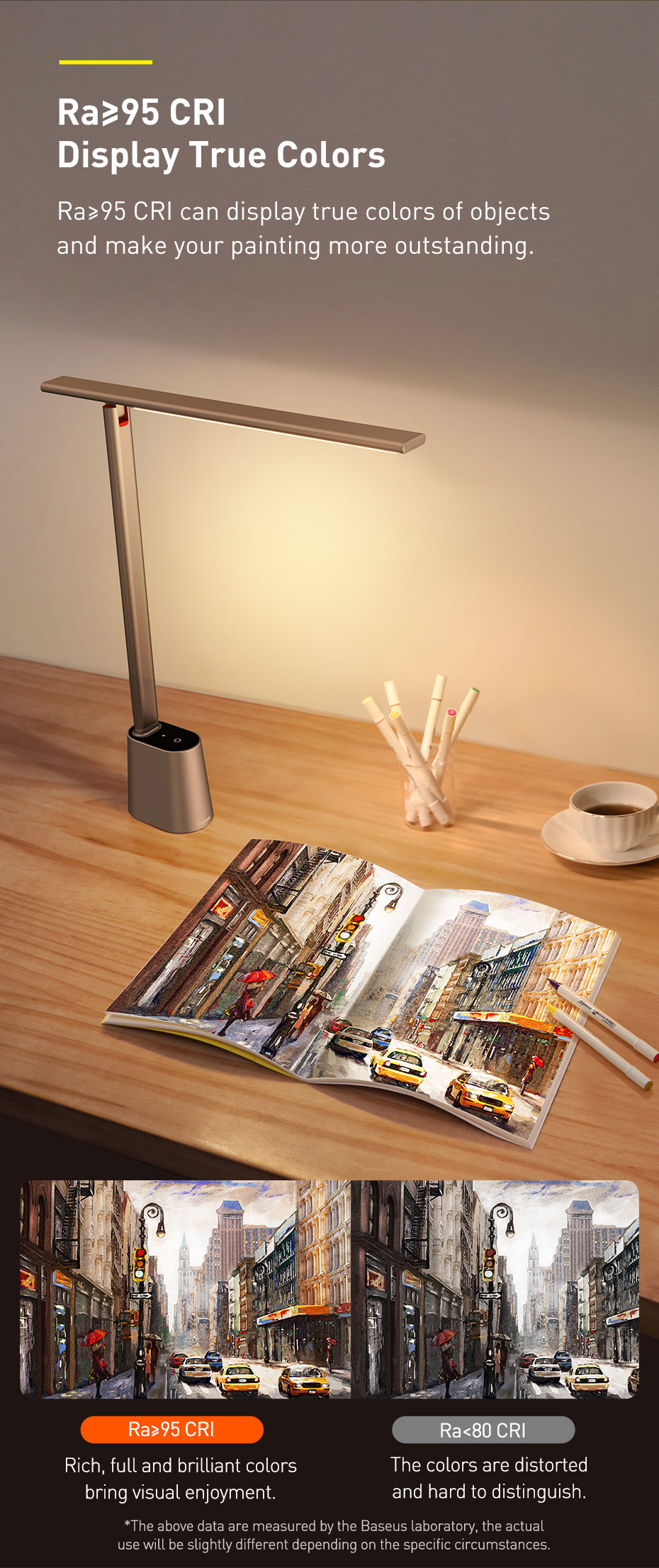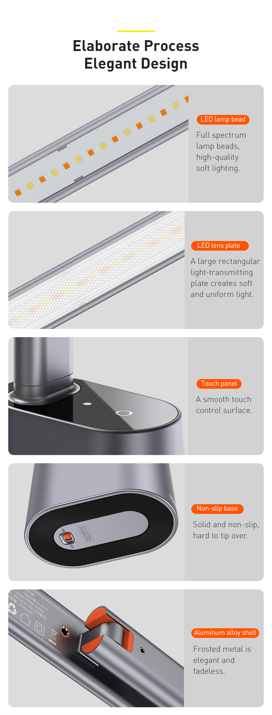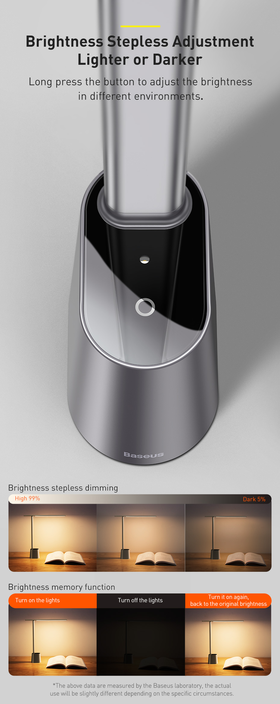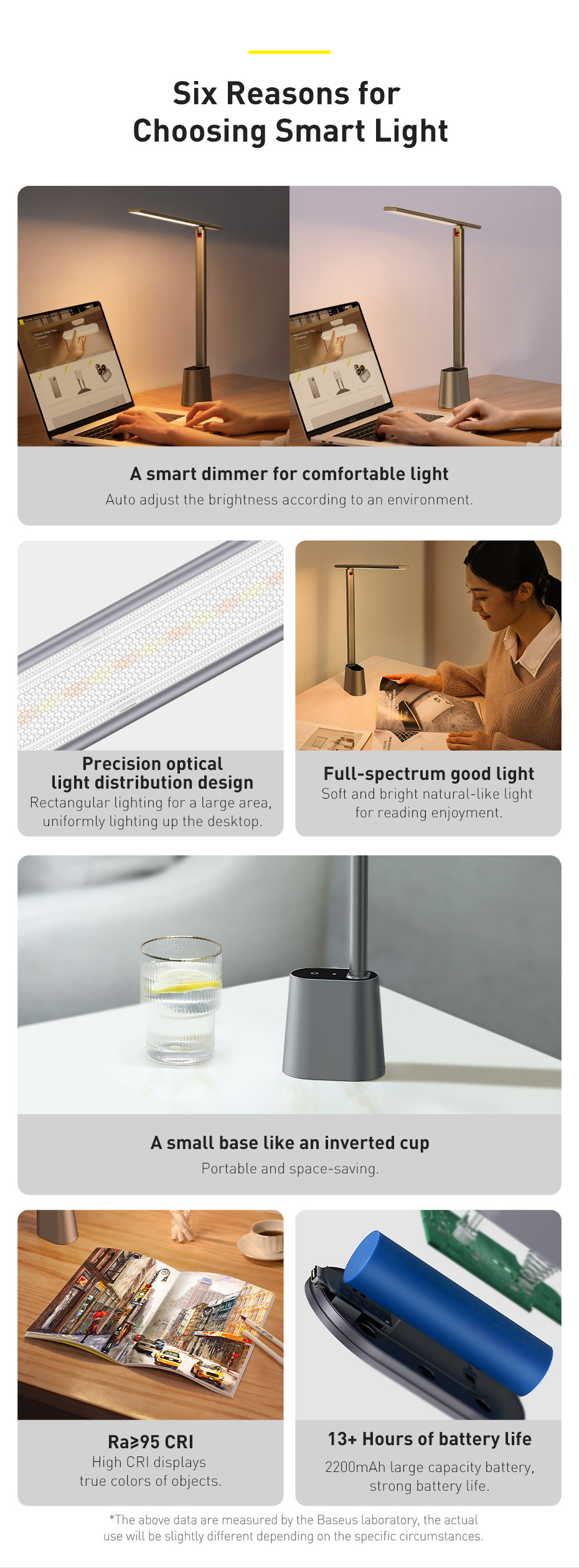 چراغ مطالعه رومیزی هوشمند قابل شارژ بیسوس، دارای نور یکنواخت و بدون پرتوی آبی برای محافظت از چشم توسط ۳۲ عدد LED که روی آنها قطعهای مستطیلی شکل قرار داده شده است که کمک میکند نور شکست داشته باشد و به خوبی در محیط گستردهتری پخش شود، به این ترتیب فضای وسیعتری پوشش داده خواهد شد.