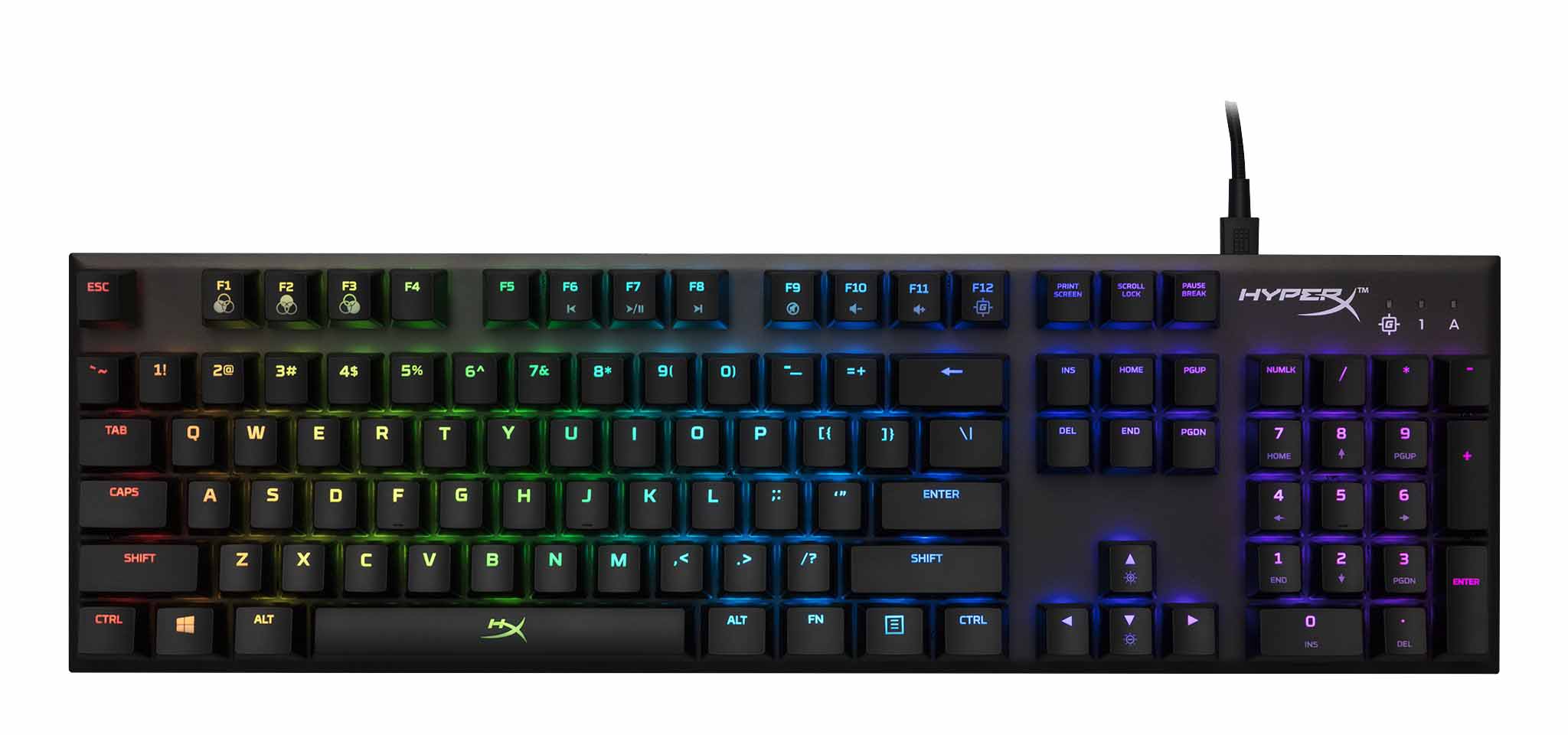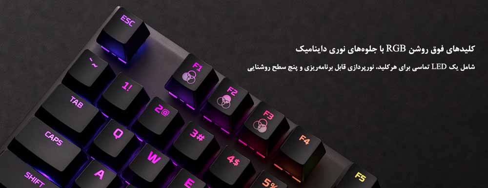 کیبورد گیمینگ HyperX Alloy FPS RGB با ظاهری تحسین برانگیز و گیرنده و عملکردی فوقالعاده، طراحی شده تا شما در هردو عامل عملکرد و استایل سرآمد باشید. LEDهای تماسی هر کلید با نورپردازی چشمگیر RGB به شما این امکان را میدهد تا نمایش نورافشانی باشکوهی را خلق کنید. این امر به آسانی در نرمافزار کاربردی HyperX NGenuity قابل برنامه ریزی است.