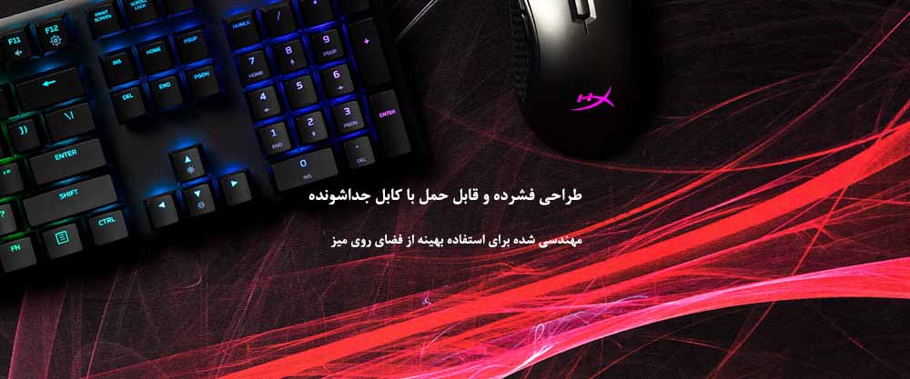 کیبورد گیمینگ HyperX Alloy FPS RGB جای کمی را اشغال میکند تا بتوانید سطح آزاد بیشتری را روی میز خود حفظ نموده و احتمالا فضای مانور بیشتری را برای حرکت ماوس داشته باشید. همچنین یک پورت شارژ USB با دسترسی آسان. کابل تافته جدا شونده ضمن اینکه از پوسته شدن و ترک خوردن روکش در امان است حمل و نقل آسان کیبورد را ممکن ساخته است. با وجود بدنه مقاوم و تو پر فلزی در لحظات نفس گیری همچون تغییر ناگهانی سلاح یا تعویض خشاب یا غنیمت گرفتن از دشمنان، احساس ثبات و ایستایی مطلوبی را تجربه خواهید نمود. کلیدهای مجهز به سوییچ مکانیکی و با دوام Kailh Silver Speed با نرخ کارکرد ۷۰ میلیون کلیک،عملکرد سریع و روانی را ارائه میدهد که ایده آل برای افردای است که در نبرد با رقبا روی صدم ثانیه ها نیزحساب نموده اند.